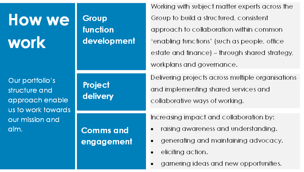 The Group Collaboration Board is made up of c-suite leaders from across the Group’s organisations and provides leadership and strategic oversight to the portfolio. Ultimately the Board is responsible for ensuring our common enabling functions are demonstrably effective, efficient, and economical; that they are value for money.